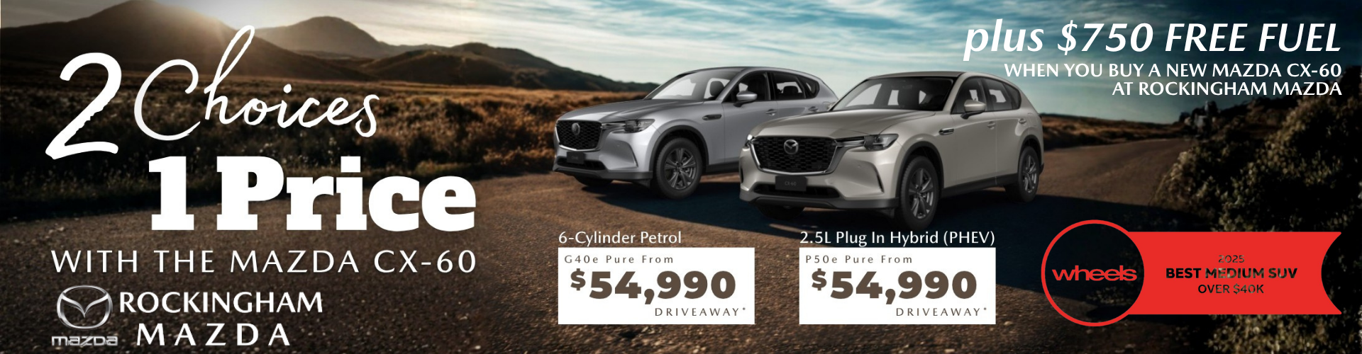The Mazda CX‑60 brings premium performance, intelligent efficiency, and award‑winning design together in one impressive SUV. With two powertrain options—a refined RWD 2.5L Petrol SkyActiv‑G or a dynamic Plug‑In Hybrid (PHEV)—you can choose the style of driving that suits your life.